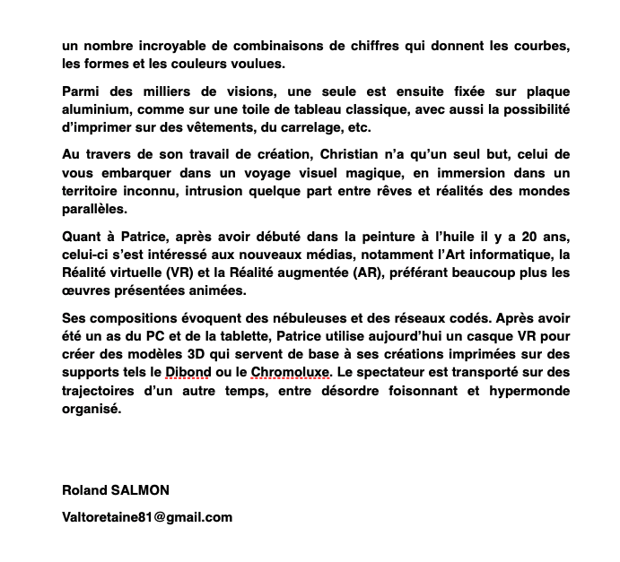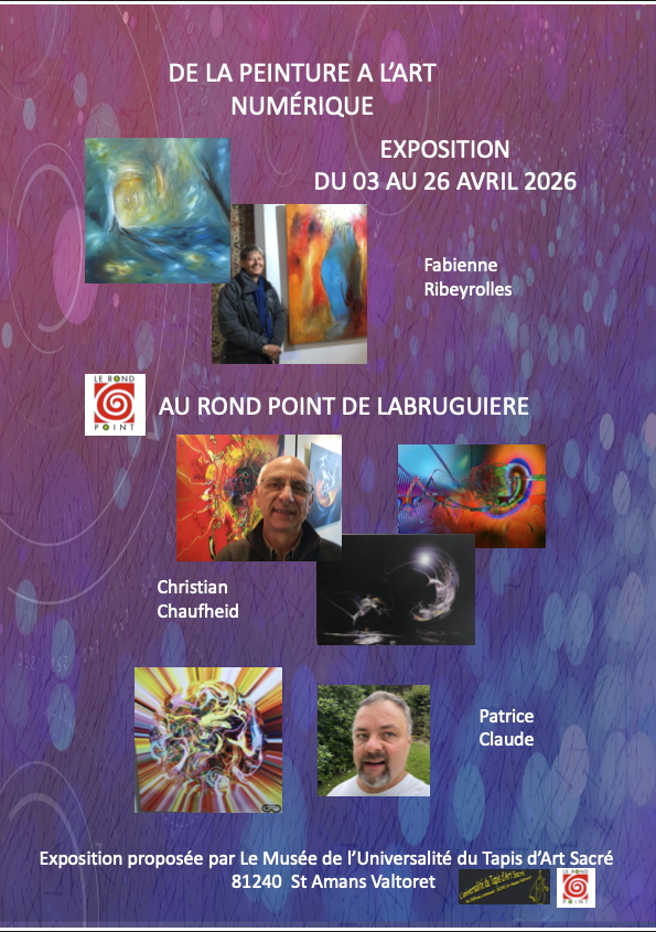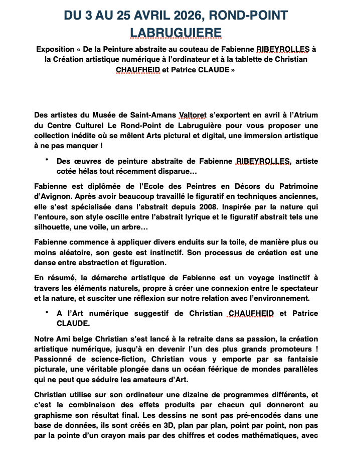 Vendredi 3 avril au dimanche 26 avril au Centre Culturel Le Rond-Point à Labruguière : Exposition d’œuvres numériques sur alu et d’Art Virtuel de nos Artistes Christian Chaufheid (vente possible) et Patrice Claude, et de peintures au couteau de notre regrettée et connue Fabienne Ribeyrolles – entrée libre